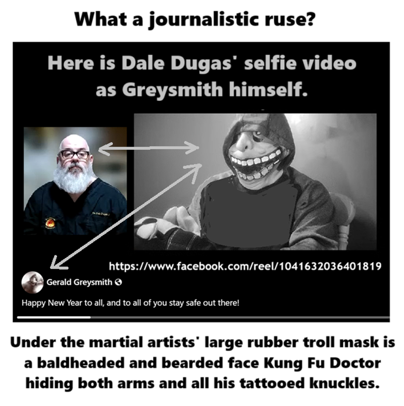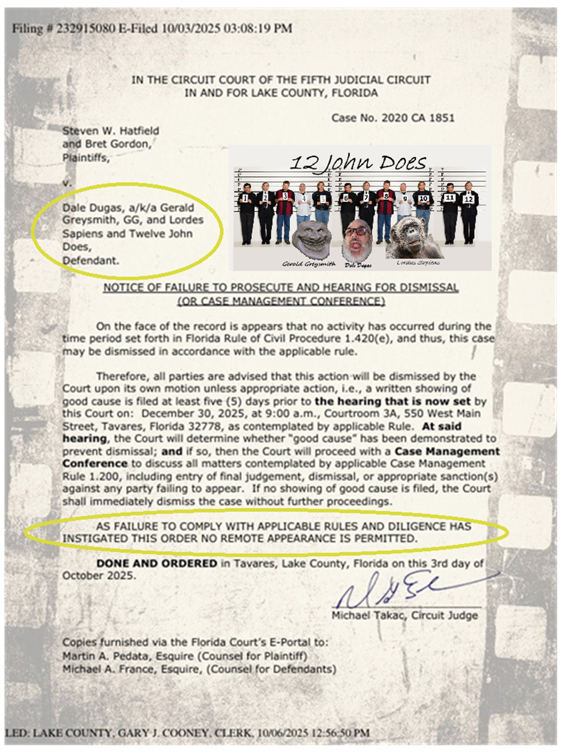 December 30th, 2025 when the Lake County, Florida Judge views and listens to Dale Dugas himself in the Defendants secret disguise Gerald J. Greysmith full rubber head mask under his long sleeves' hoodie sweatshirt covering his remarkable arm tattoos and gloves hiding his full set of ten knuckle tattoos.